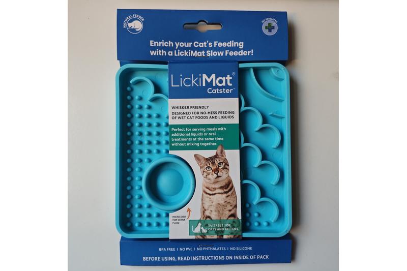 LickiMat Schleckmatten sind eine interaktive Fütterungsmatte für Katzen, die perfekt dazu geeignet sind, Feuchtfutter, flüssige Nahrungsergänzungen, Rohfutter, Flüssigkeiten oder Kätzchenmilch Dosenfisch, Gele darzureichen. Die natürlichen Instinkte der Katze, Flüssigkeiten mit der rauhen Zunge von Oberflächen abzulecken, werden genutzt, so dass sie mehr Zeit mit der Nahrungsaufnahme verbringt und sich sowohl Nahrung erarbeitet, als auch letztere artgerechter als aus einer Schüssel aufnehmen kann.