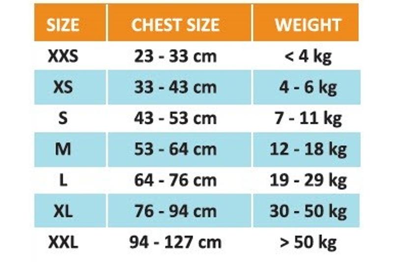 Das Thundershirt gibt es in sieben Größen von XXS (5,5 kg) bis XXL (40 kg).